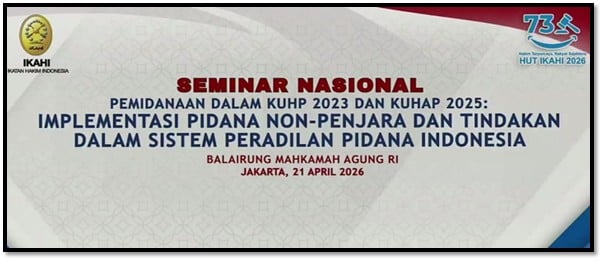 Jakarta, GemaTipikor – Ikatan Hakim Indonesia memperingati Hari Ulang Tahun (HUT) ke-73 dengan menggelar seminar nasional bertajuk “Pemidanaan dalam KUHP 2023 dan KUHAP 2025: Implementasi Pidana Non-Penjara dan Tindakan dalam Sistem Peradilan Pidana Indonesia”. Kegiatan ini berlangsung secara hybrid di Balairung Mahkamah Agung Republik Indonesia dan diikuti oleh jajaran hakim dari seluruh Indonesia,(Selasa 21 April 2026).