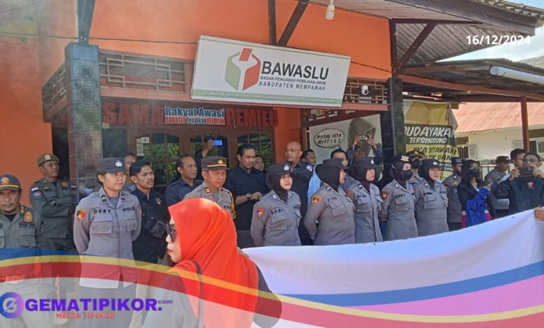 Mempawah, Gematipikor.com – Pada hari Senin, 16 Desember 2024, ratusan massa yang tergabung dalam Koalisi Rakyat Penyelamat Demokrasi (KRPD) melakukan aksi damai di depan kantor Badan Pengawas Pemilu (Bawaslu) Kabupaten Mempawah, Kalimantan Barat. Aksi ini dilakukan sebagai bentuk protes dan tuntutan agar Komisi Pemilihan Umum (KPU) Kabupaten Mempawah bertanggung jawab atas pelaksanaan Pemilihan Kepala Daerah (Pilkada) yang berlangsung pada 27 November 2024 lalu.