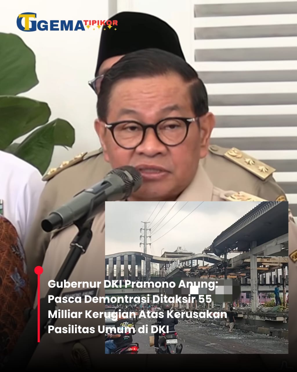 JAKARTA, Gematipikor.com – Aksi demonstrasi besar yang terjadi di wilayah DKI Jakarta meninggalkan kerusakan serius pada sejumlah fasilitas umum. Berdasarkan keterangan resmi Forum Koordinasi Pimpinan Daerah (Forkopimda) yang dipimpin langsung oleh Gubernur DKI Jakarta, Pramono Anung, nilai kerugian akibat kerusakan tersebut diperkirakan mencapai Rp55 miliar.