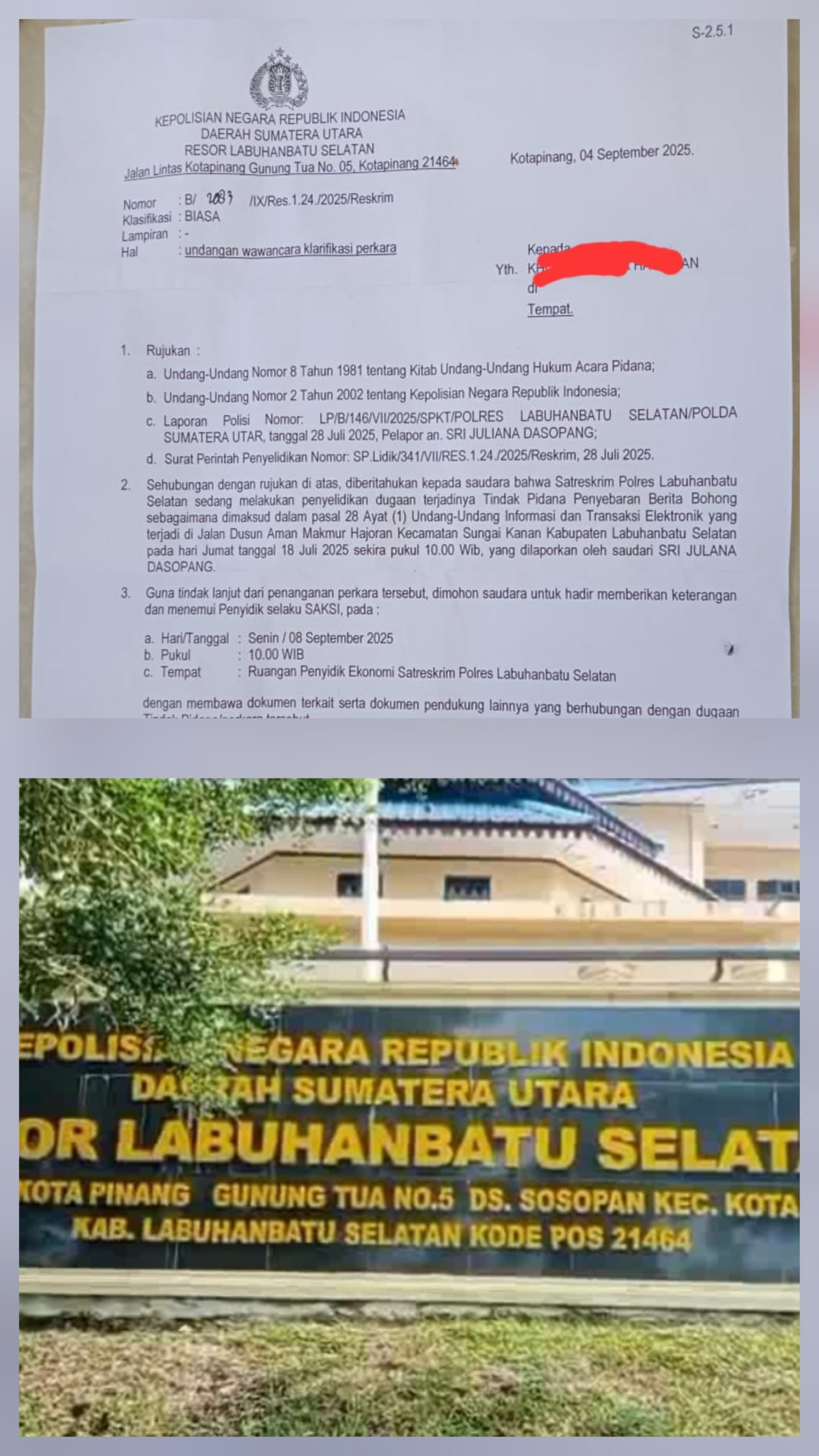 Berdasarkan surat pemanggilan wartawan yang tertuang dalam surat resmi Polres Labusel nomor 2083/IX/res 1.24/2025/Reskrim, tertanggal 4 September 2025. Namun, sejumlah kalangan menilai adanya indikasi pengkriminalisasian terhadap tiga wartawan di Kabupaten Labuhanbatu Selatan.