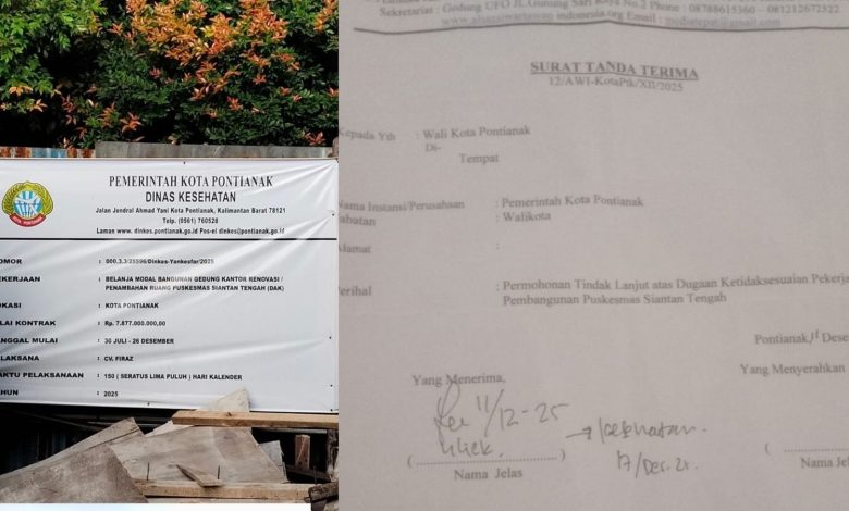 Pontianak I GemaTipikor – Dugaan ketidaksesuaian spesifikasi teknis dalam proyek pembangunan Puskesmas Siantan Tengah Tahun Anggaran 2025 kian menguat. Hingga Senin (29/12/2025), surat resmi yang dilayangkan Tim Monitoring Aliansi Wartawan Indonesia (AWI) Kota Pontianak kepada Wali Kota Pontianak, Dinas PUPR, serta Pejabat Pembuat Komitmen (PPK) Dinas Kesehatan belum mendapat jawaban sedikit pun.