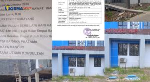 Berdasarkan papan informasi proyek, pekerjaan dimulai pada 21 Juli 2023 dengan durasi pelaksanaan 150 hari kalender, nilai kontrak mencapai Rp36,789 miliar, dan dikerjakan oleh PT Budi Bangun Konstruksi. Namun hingga berita ini diturunkan, rumah sakit tersebut belum beroperasi dan belum melayani masyarakat—sebuah kondisi yang memunculkan pertanyaan mendasar: atas dasar apa peresmian dilakukan jika bangunan belum siap difungsikan?