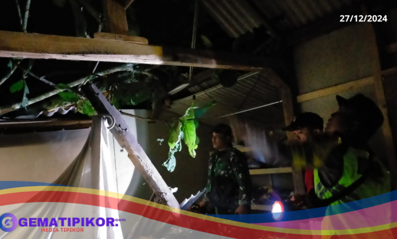 NGAWI, Gematipikor.com – Sebuah rumah warga di Kecamatan Sine, Kabupaten Ngawi, mengalami kerusakan setelah tertimpah pohon jati yang tumbang akibat angin kencang, pada Kamis malam (26/12), sekitar pukul 18.30 WIB.