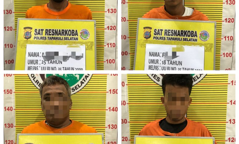 PALUTA,Gematipikor.com- Satres Narkoba Polres Tapanuli Selatan berhasil melakukan pengungkapan tindak pidana penyalahgunaan Narkoba di Wilayah Hukum Polres Tapanuli Selatan, 4 (empat) pelaku yaitu HMS (24), SA (26), FA (18), RS (48), di Dusun Parsadaan KUD Desa Langkimat Kecamatan Simangambat Kabupaten Padang Lawas Utara, Minggu tanggal 25 Mei 2025 sekira pukul 14.30 Wib.