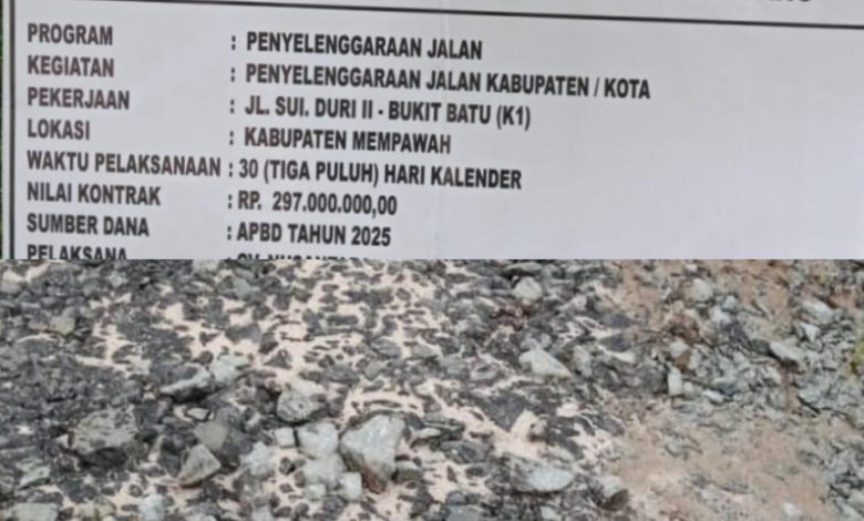 Mempawah I Gema Tipikor — Proyek tambal sulam di ruas Jalan Sungai Duri Dua–Bukit Batu Kabupaten Mempawah yang dikerjakan CV Nusantara kini menjadi bahan perbincangan hangat. Alih-alih menghadirkan infrastruktur yang layak, hasil pekerjaan justru dinilai minim kualitas dan terkesan dikerjakan sekadar menggugurkan kewajiban.
