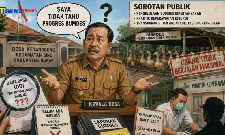 Ngawi, Gematipikor.com — Sorotan publik mengarah pada tata kelola pemerintahan Desa Ketanggung, Kecamatan Sine, Kabupaten Ngawi, setelah Kepala Desa Sri Joko mengakui keterbatasan pengetahuannya terkait perkembangan Badan Usaha Milik Desa (Bumdes) yang mengelola unit usaha peternakan bebek petelur. Pernyataan tersebut disampaikan saat dikonfirmasi awak media di kantornya pada Rabu (22/4/2026).